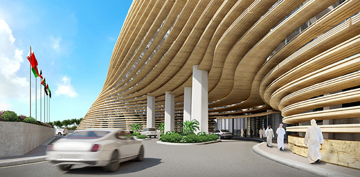 The Qatar National Convention Centre Hotel architectural concept is an eroded sandstone hill in the Qatar desert.