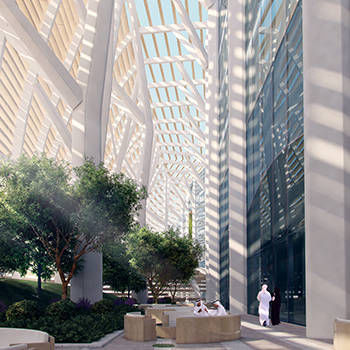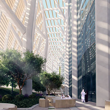 Landscaped courtyards, cutouts and space between the outer screen and the inner building eliminate the boundaries between indoors and outdoors.