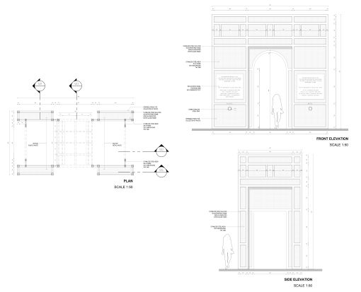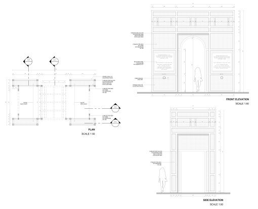 The structure follows the traditional architectural rules of proportions which are represented by the division with the mullions. At the bottom of the structure at four sides, there are four bins for recyclable waste. On each side there is one bin for plastic and one bin for metal waste. The bins will collect the waste throughout the exhibition.