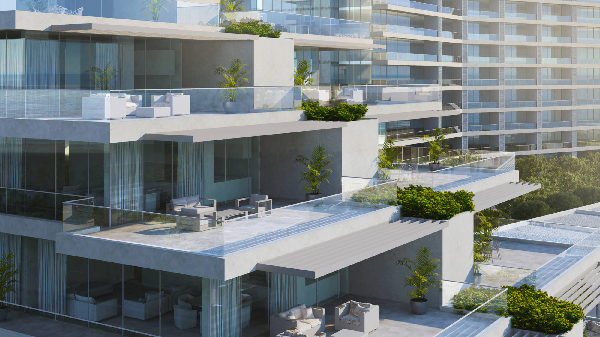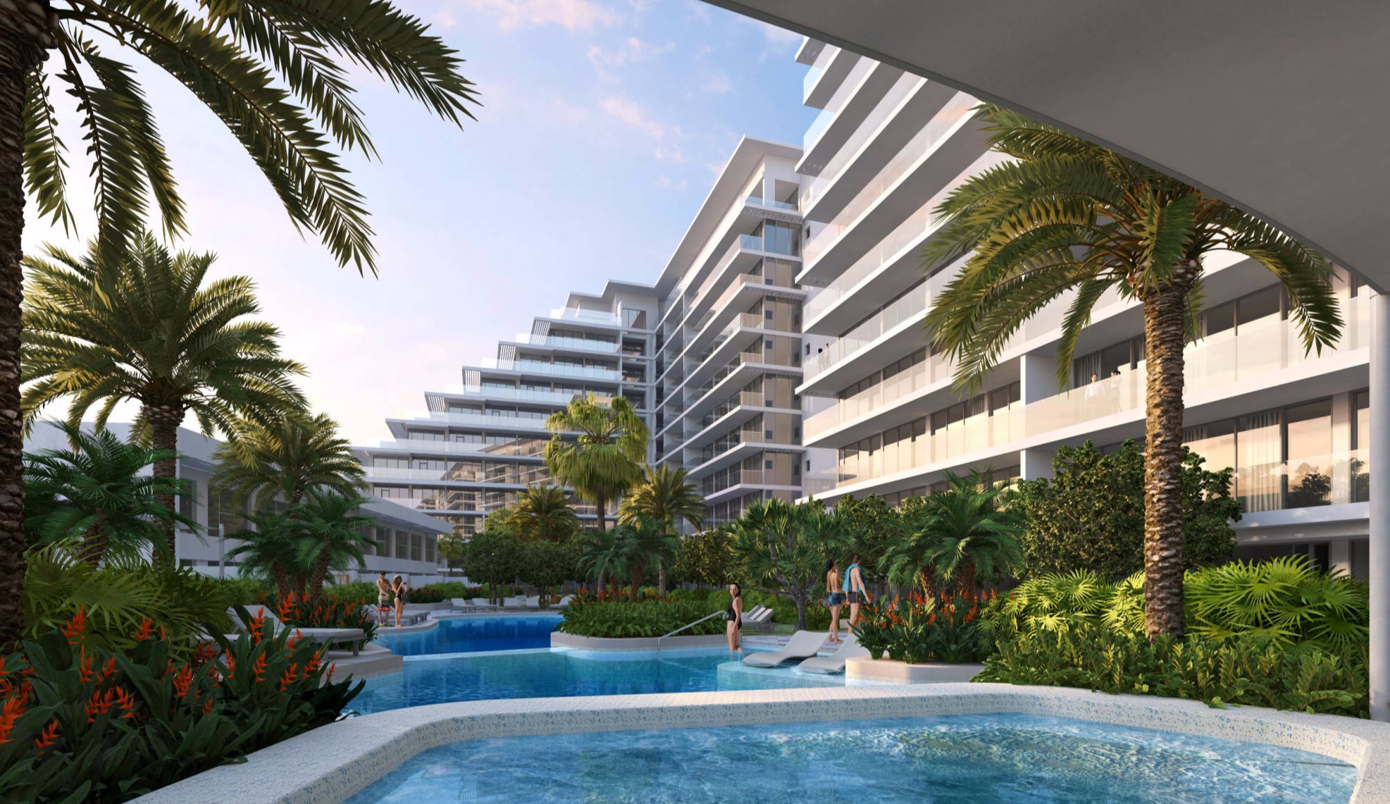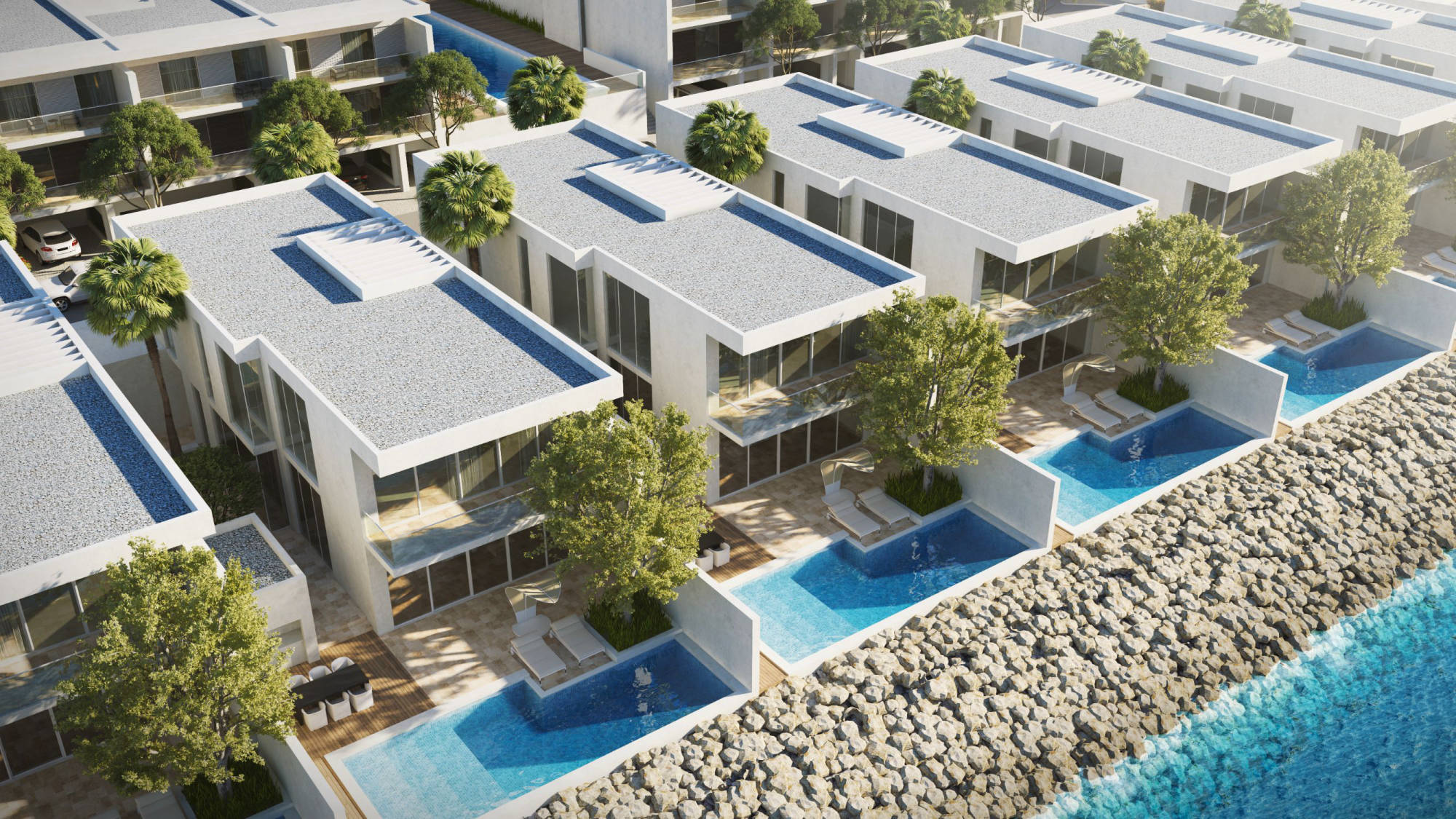 Waterfront villas, town houses and apartments share a resort feel landscaped park with pools, lawns and playgrounds. Residences have large balconies that provide shadow and totally open glass facades facing the water on both sides of the development.